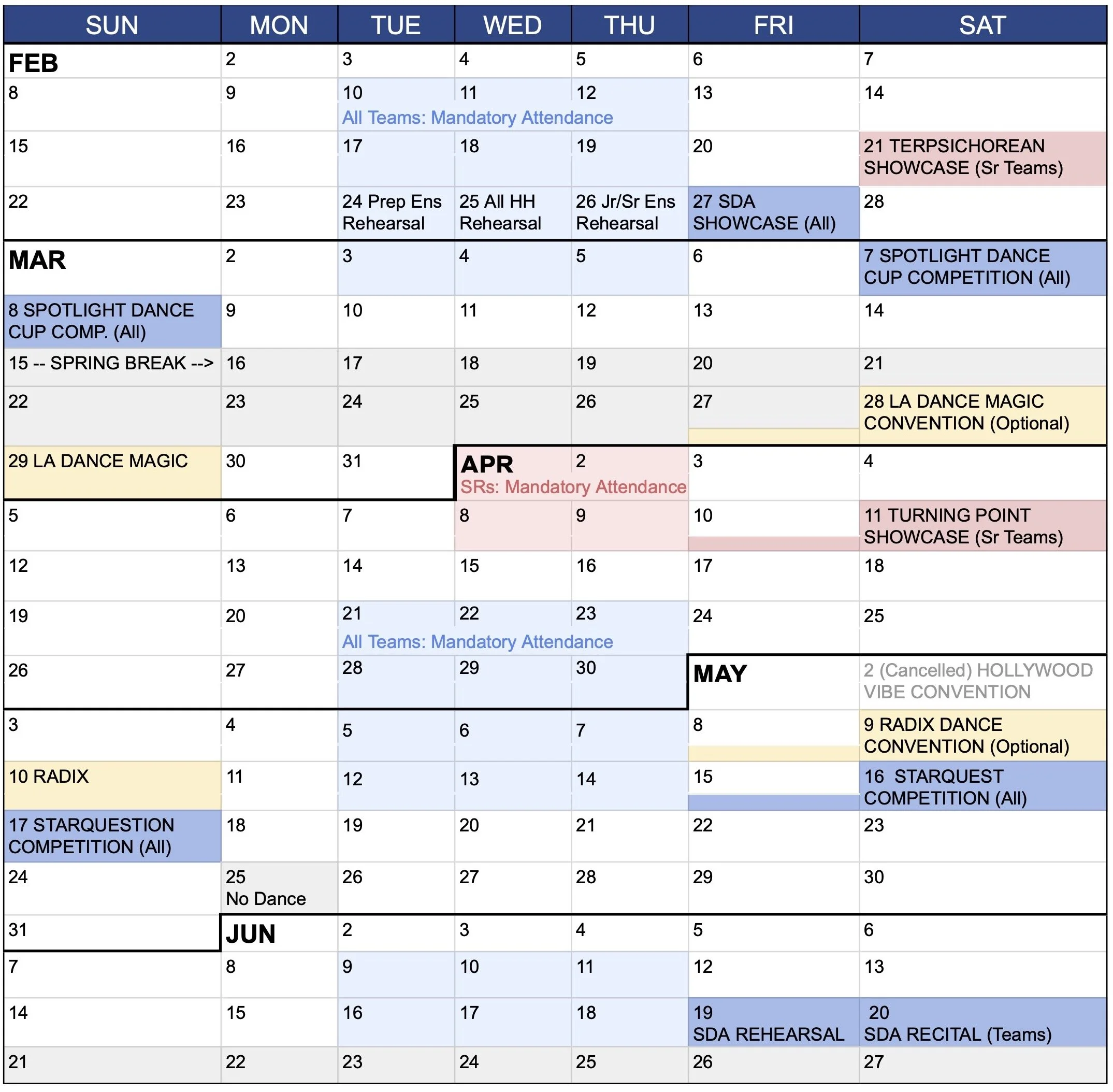 All team members are required to attend their respective team classes during the WEEKS of Feb 9th, Feb 16th, Feb 23rd, Mar 2nd, Apr 20th, Apr 27th, May 4th, May 11th, Jun 1st, Jun 8th